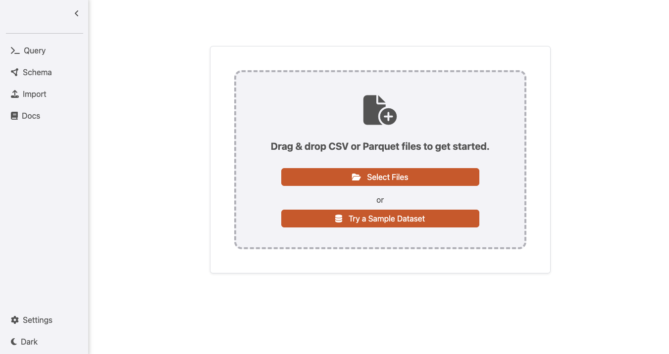 The Import Panel allows you to import data into your database from CSV or Parquet files via the UI. You can create new node/relationship tables or import data into existing tables via the imported files. To get started, click on the “Import” tab on the top right.