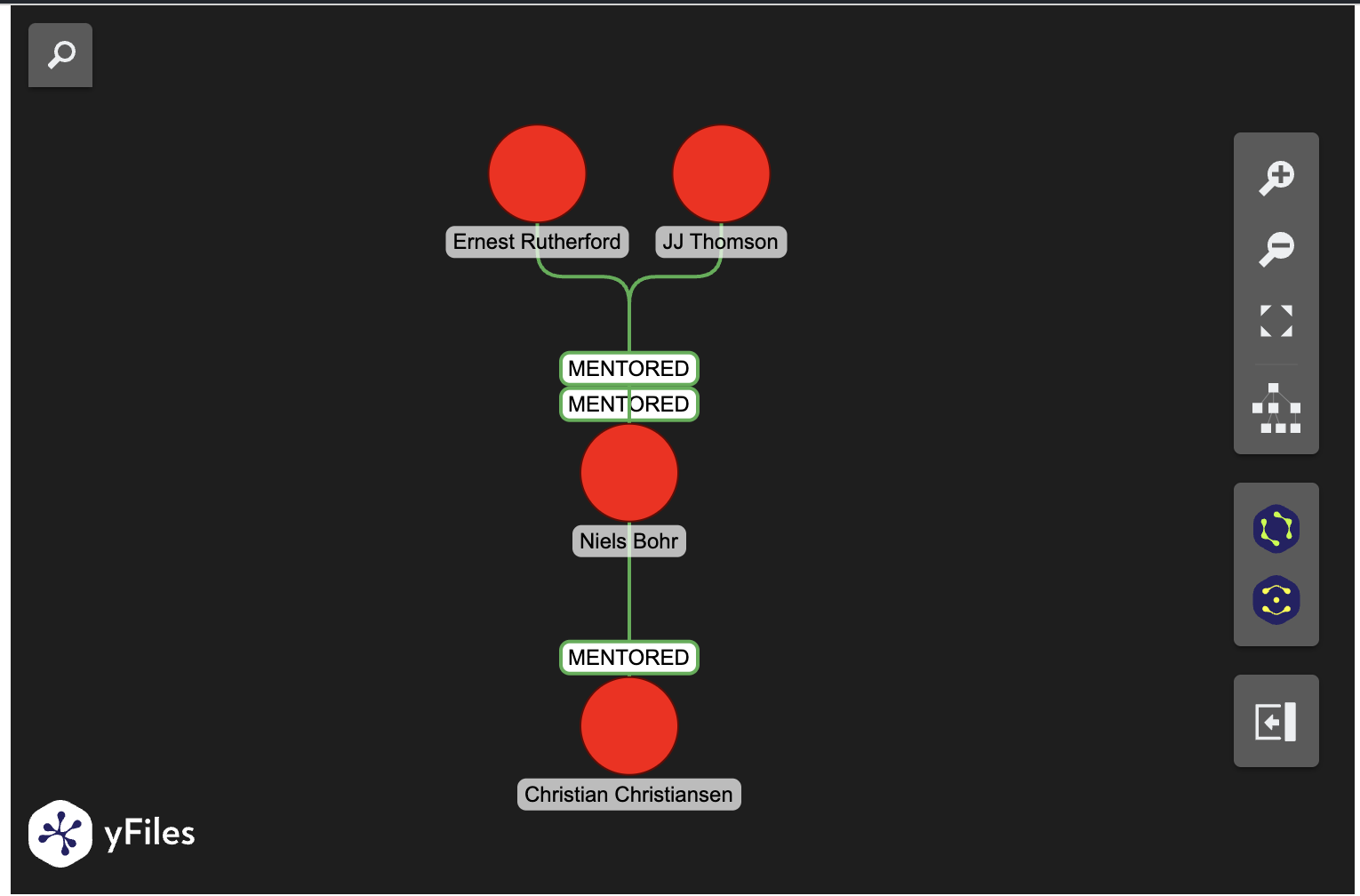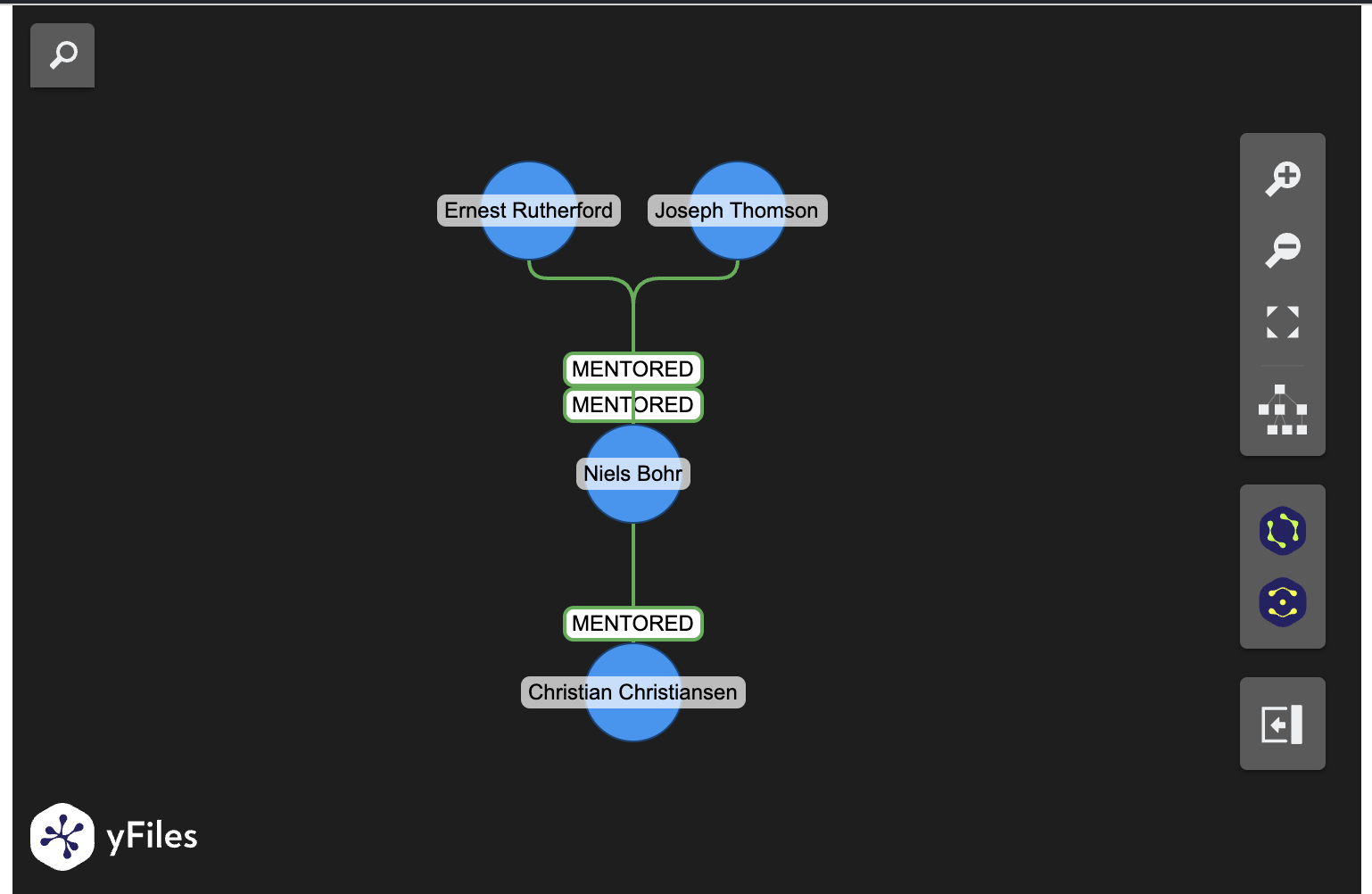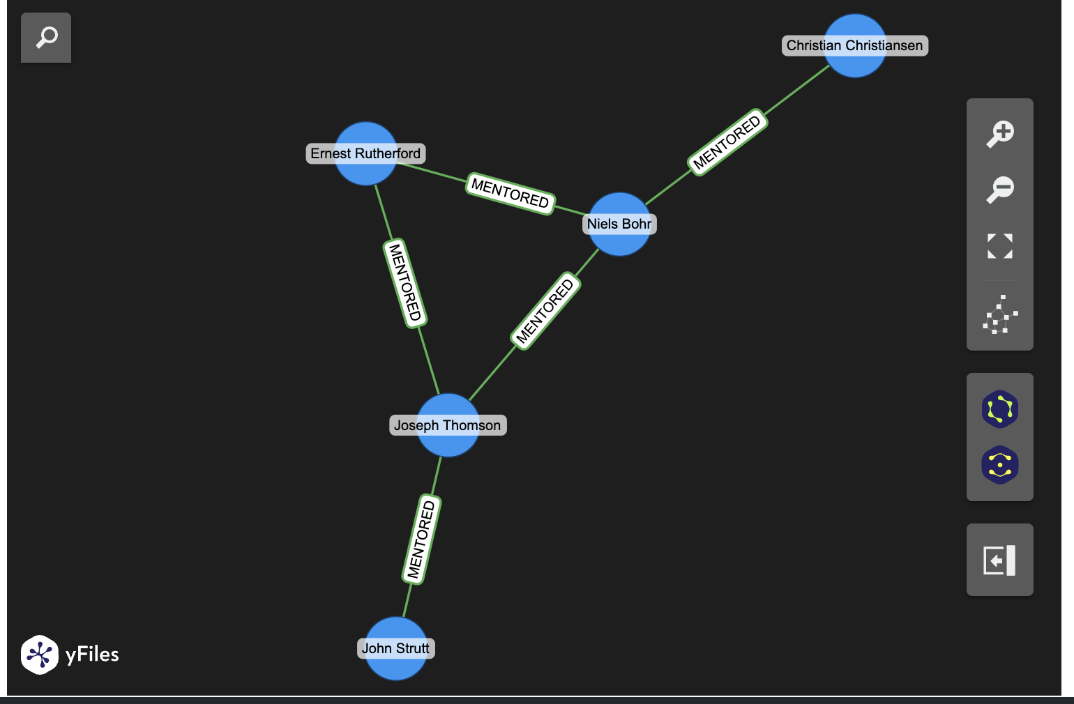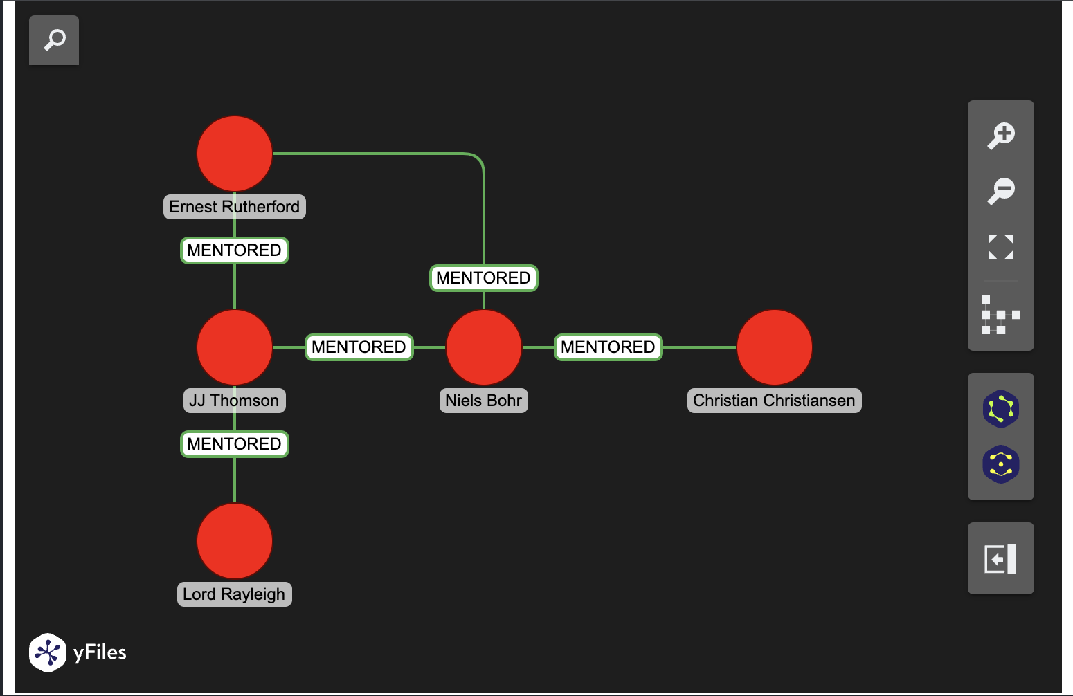 import real_ladybug as lbfrom yfiles_jupyter_graphs_for_kuzu import KuzuGraphWidget# Open a new in-memory databasedb = lb.Database(":memory:")conn = lb.Connection(db)# Create tablesconn.execute("CREATE NODE TABLE Person(name STRING PRIMARY KEY, alias STRING)")conn.execute("CREATE REL TABLE MENTORED(FROM Person TO Person)")# Insert dataconn.execute(""" MERGE (a:Person {name: "John Strutt", alias: "Lord Rayleigh"}) MERGE (b:Person {name: "Joseph Thomson", alias: "JJ Thomson"}) MERGE (c:Person {name: "Ernest Rutherford", alias: "Ernest Rutherford"}) MERGE (d:Person {name: "Niels Bohr", alias: "Niels Bohr"}) MERGE (e:Person {name: "Christian Christiansen", alias: "Christian Christiansen"}) MERGE (a)-[:MENTORED]->(b) MERGE (b)-[:MENTORED]->(c) MERGE (b)-[:MENTORED]->(d) MERGE (c)-[:MENTORED]->(d) MERGE (d)-[:MENTORED]->(e)""")Display graph with default layout